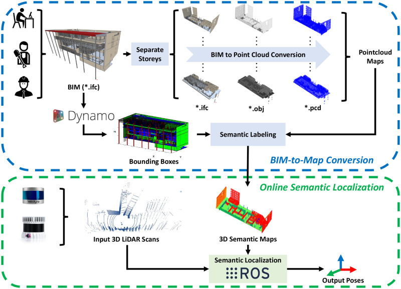 This paper advances automation in AEC robotics by enabling mapping-free localization using existing BIM models. BIM elements are converted into semantically enriched point-cloud maps, and a coarse-to-fine semantic ICP alignment localizes a mobile 3D LiDAR with only one sensor. Experiments show reliable pose tracking and reduced errors, lowering labor and computation for autonomous navigation.