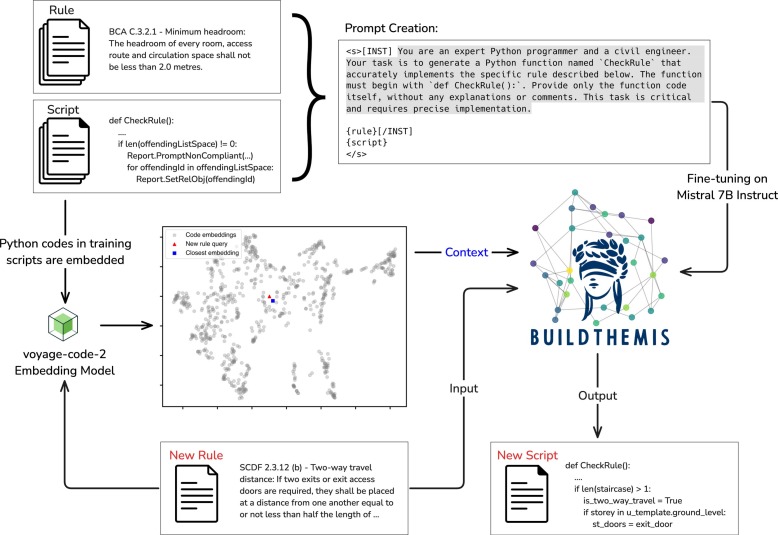 BuildThemis advances digitalization in AEC by automating the conversion of textual building regulations into computer-processable compliance-checking scripts. It combines a fine-tuned large language model with Retrieval-Augmented Generation to produce structured draft code grounded in an external knowledge base. This improves script quality, generalization, and reuse, accelerating rule digital transformation.